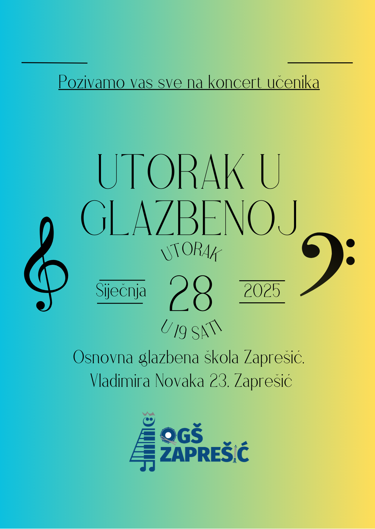 Pozivamo vas sve na koncert učenika OGŠ Zaprešić “Utorak u Glazbenoj” 28. 1. 2025. u 19 sati.